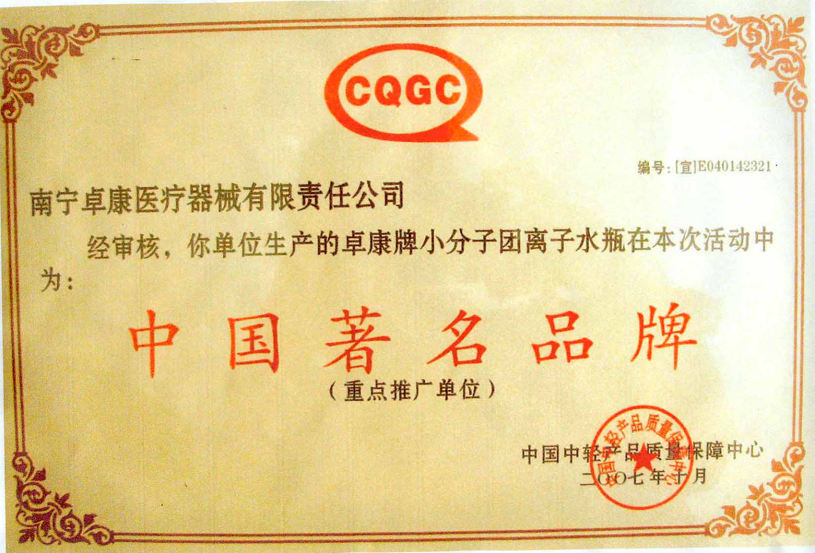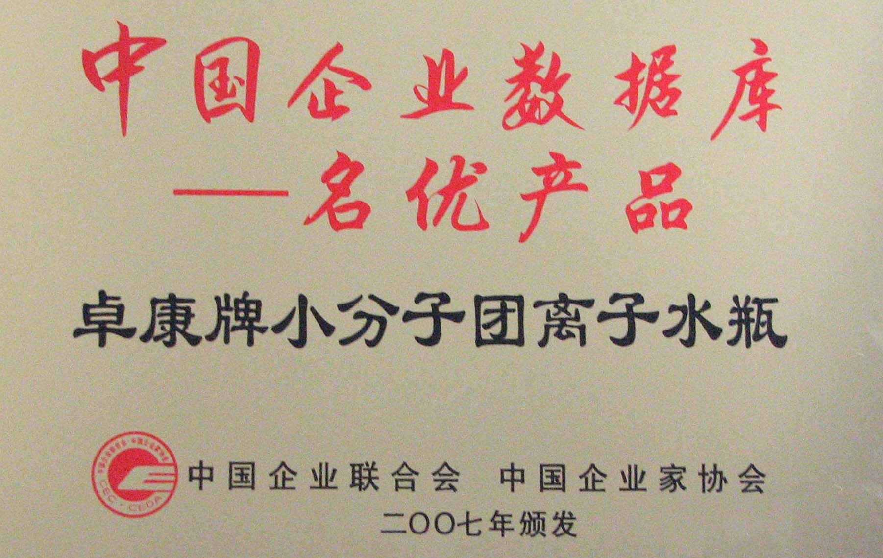 卓康牌離子水瓶榮獲中國企業(yè)名優(yōu)產品[點小圖見大圖]、中國著名品牌稱號[點小圖可見大圖]