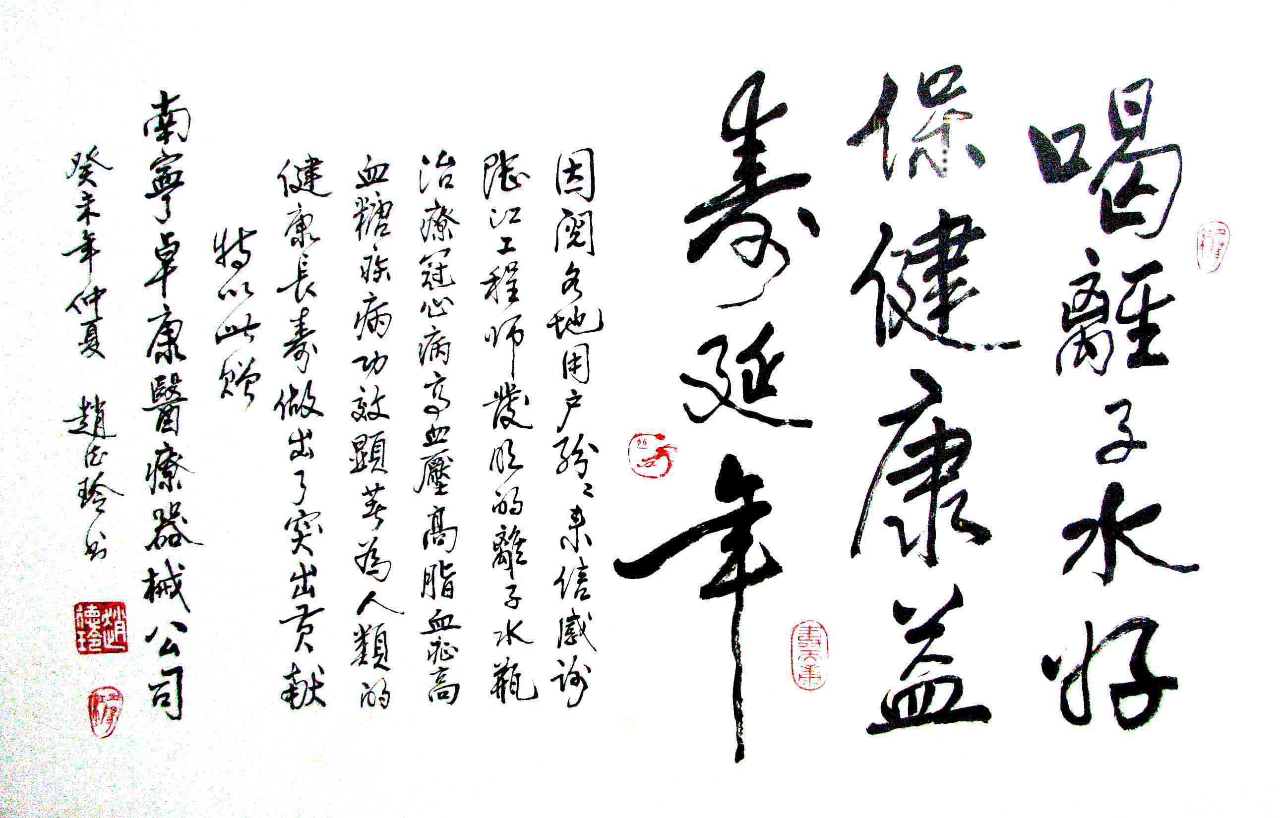 - -- 幾千年來,人類靠醫(yī)藥不能根治冠心病、高血壓和糖尿病,如想根治,那是夢想。可是,我從中國基礎醫(yī)學研究成果受到啟發(fā),研發(fā)了一種發(fā)明產品,處理出微小分子團水讓人飲用,實現(xiàn)了人類這一夢想!患者飲用后遠離了冠心病、高血壓和2型糖尿病。這一成果曾經(jīng)過臨床試用和專家鑒定,作為準字號醫(yī)療器械讓廣大患者飲用,療效進行跟蹤調查。很多患者的反饋情況令人感動,我放在公司網(wǎng)站上(nnzk.com),震撼了醫(yī)學專家,也使廣大同胞受到啟發(fā)。人們盼望飲用它給細胞補水,治愈多種病癥,既省錢,又安全,而且延長壽命。