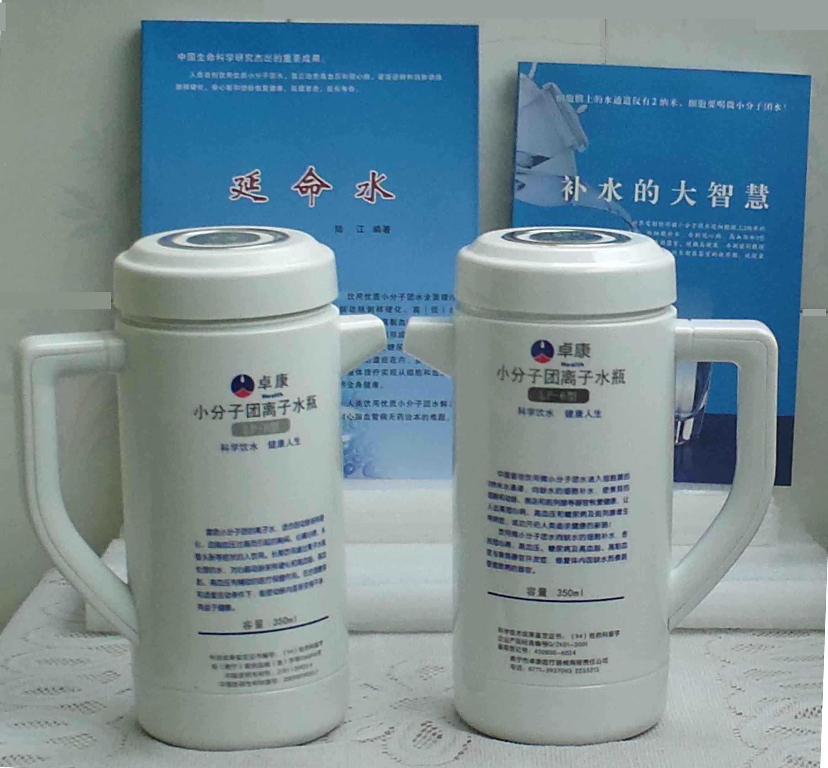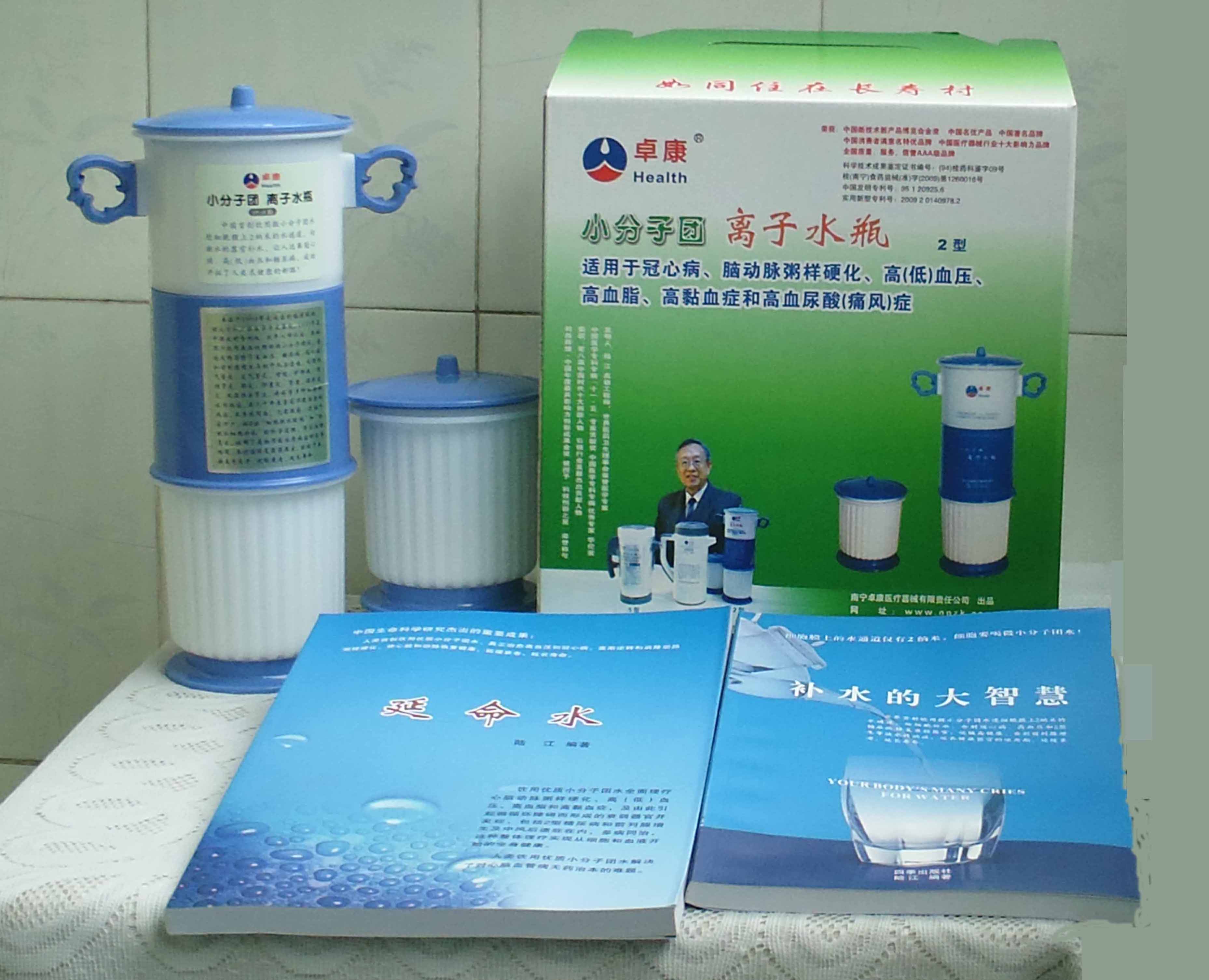 本品大量用戶的使用效果表明,能治愈冠心病、腦動脈硬化、原發(fā)性高(低)血壓、高血脂、高粘血癥、高血尿酸癥(痛風)和2型糖尿病、衰弱器官并發(fā)癥(前列腺增生、腎衰與尿毒癥)及中風后遺癥等療效好。產品配信譽卡。使用壽命30年,不換芯,易清洗。團購優(yōu)惠。從郵局匯款,匯費1%,地址按本頁下方地址、聯(lián)系人寫。從銀行匯款,請點擊[聯(lián)系匯款]欄,從工商銀行匯款,建設銀行、農業(yè)銀行匯款,均免收匯費,匯款后20--30分鐘內發(fā)短信,可用微信轉帳,均免匯費,微信號即手機號13768308380。匯款后,告知你的姓名和地址,我公司聯(lián)系人手機號是:13768308380卓康牌離子水瓶為我公司獨家生產,郵購產品配《補水的大智慧》彩印書一本,另配四季出版社出版的新書《補水的大智慧》一本,并配光盤一張(含央視主持人釆訪陸江的對話視頻)。目前市場和"淘寶網(wǎng)"上有人兜售假冒的偽品,望讀者審察辯別真?zhèn)危旒僬哓飧`假冒本公司的各種證、獲獎獎項、專利號和外包裝盒上的中英文字,包括科技成果的鑒定意見等,請讀者注意防偽。如何識別假貨?已經(jīng)買了假貨怎么辦?(請點擊[打假掠影][打假掠影])。