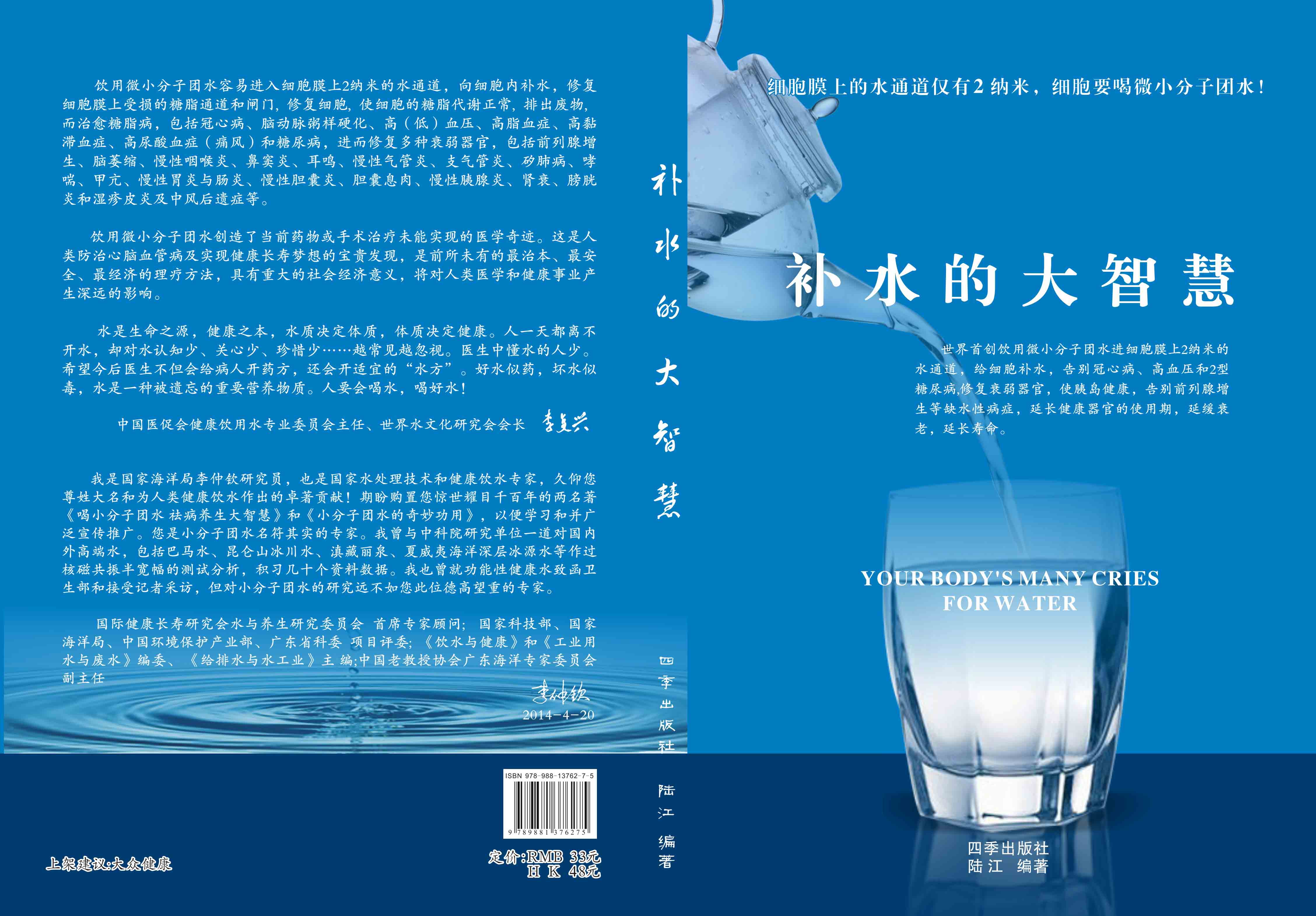 4. 陸 江新編著《延命水》一書,全彩色印刷A4內頁P240 ;2014年由香港出版的《補水的大智慧》一書,全彩色印刷16K內頁P218,郵購贈此書,均送光盤。