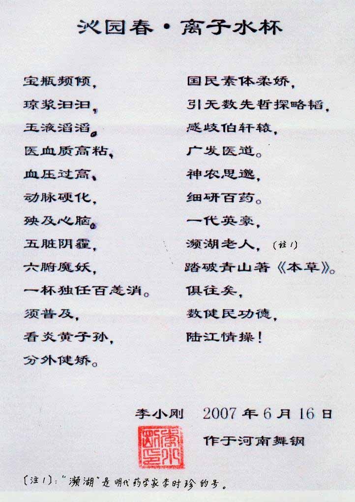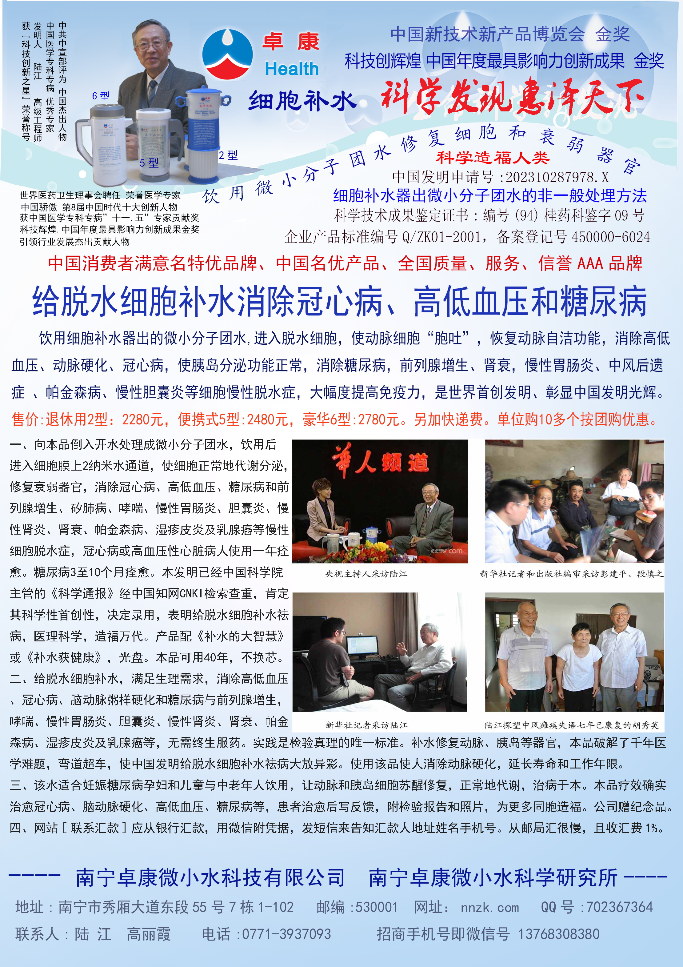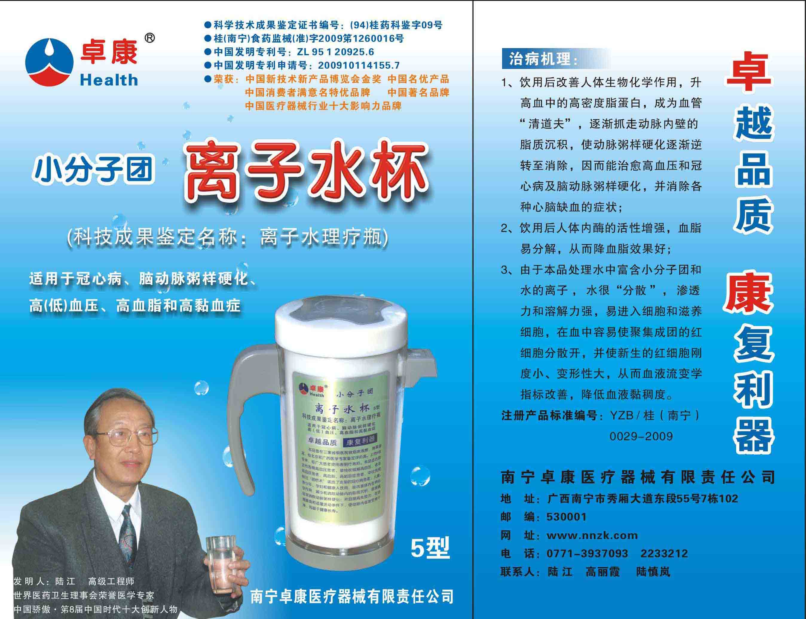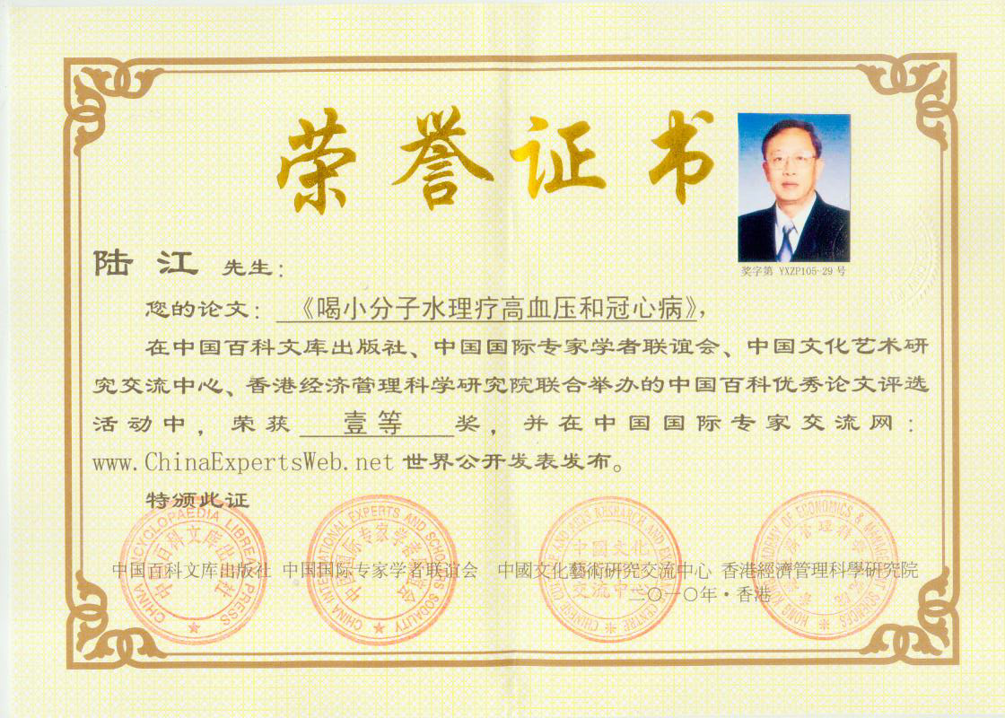-----我是從事建筑的高工,本來沒有資格去攻克醫(yī)學難題,卻為了自身健康才扣響醫(yī)學的大門。由于我1990年患高血壓,因怕中風才研究發(fā)明了離子水瓶,我把水處理成微小分子團水,飲用后治愈了高血壓。便于1993年底送到三家省級醫(yī)院做臨床試用4個月。經(jīng)北京和廣西醫(yī)學專家鑒定:"降脂降壓效果好"," 能擴大心腦動脈流量,改善心腦電圖以及微循環(huán)","對治療心腦動脈粥樣硬化、高血壓、高血脂有良好的醫(yī)療保健作用。""產品的技術性能和療效達到了同類產品的國內領先水平,經(jīng)廣西醫(yī)學科學情報研究所檢索,未見國外有類似報道。"中國醫(yī)學科學院張正國教授從美國國立醫(yī)學圖書館數(shù)據(jù)庫存Medline檢索英俄文資料,均未見類似報告。2000年上市后,我為了對消費者負責而繼續(xù)觀察研究,一直通過《信譽卡》和《質量跟蹤調查書》向患者承諾療效,請用戶使用6個月后反饋效果。和脂壓患者飲用2至5個月內,消除癥狀,停服藥物,血壓正常;冠心病患者飲用3~5個月逐漸減輕至消除心絞痛、房顫等癥狀,不再服藥,飲用1年左右心電圖正常,經(jīng)冠脈造影掃描無明顯狹窄,表明冠心病痊愈。大量患者還反映許多衰弱器官被修復,讓前列腺增生、慢性咽喉炎、慢性氣管炎、支氣管炎、慢性胃炎、腸炎和膽囊炎等不藥而愈;2型糖尿病患者是因為胰島衰弱致病,飲用該水半年至一年,逐漸減藥至停藥,血糖尿糖正常,真正治愈2型糖尿病。中風后遺癥患者飲用六七個月,可逐漸減輕至消除肢體和語言障礙,表明飲用該水能讓壽命很長的神經(jīng)元細胞逐漸修復,奇跡般地恢復肢體和語言功能。飲用后還使胸腺和脾臟兩個重要的免疫器官被修復和增強,產生免疫細胞多,提高了免疫力,使人不生病或少生病。自此, 飲用微小分子團水創(chuàng)造了攻克冠心病、高(低)血壓和糖尿病三大醫(yī)學難題的奇跡。人們對此感到不可思議,但實踐是檢驗真理的唯一標準。