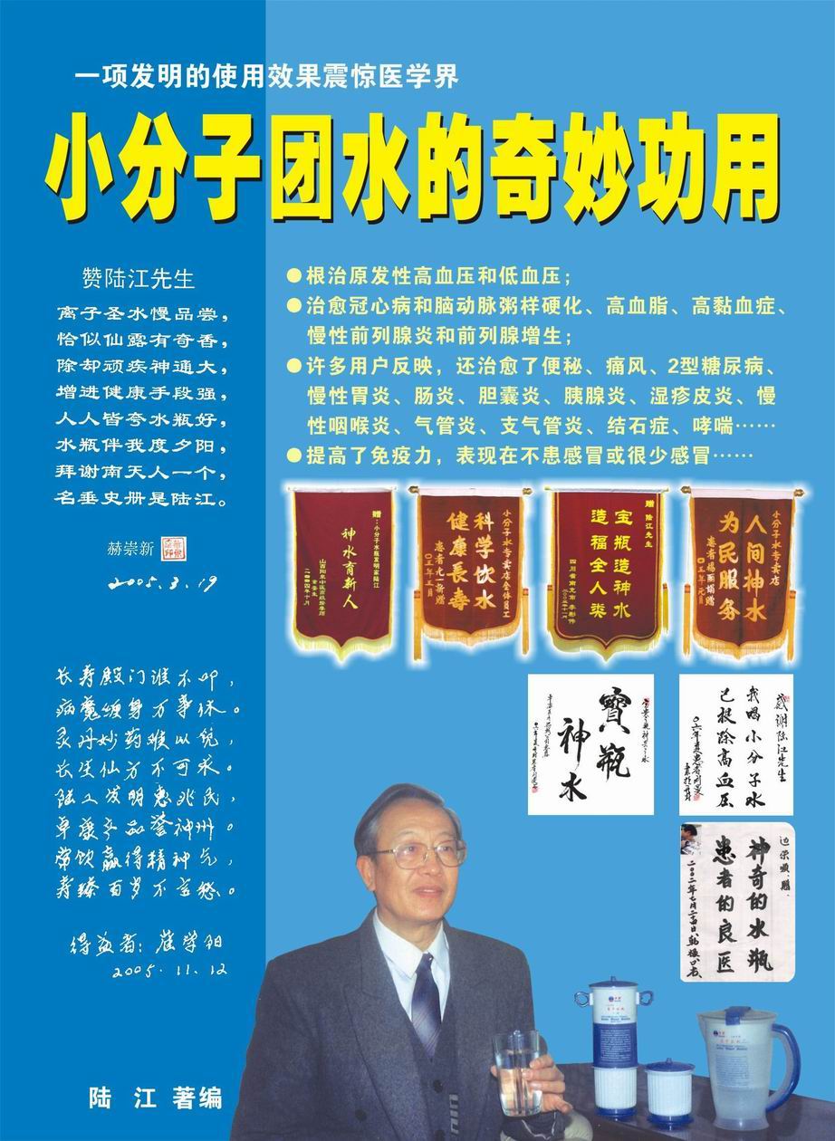 人類幾千年來患以上病癥需終生服藥,幾十年也不能治愈。可是我國南寧的高級工程師陸 江,于1990年想根治高血壓,研究發(fā)明了離子水瓶,處理出微小分子團水供飲用,經(jīng)過醫(yī)院臨床試用和專家鑒定,1999年獲中國發(fā)明專利權,產品于2000年投放市場后一直跟蹤調查,據(jù)全國各地用戶反饋:祛除了高低血壓、糖尿病和冠心病,并使前列腺增生、咽喉炎、鼻竇炎、慢性氣管炎、支氣管炎、矽肺病、哮喘、慢性胃炎、腸炎、慢性膽囊炎、慢性腎炎、腎衰、膀胱炎、便秘、痔瘡、風濕性關節(jié)炎和濕疹皮炎及中風后遺癥等病癥不藥而愈。為什么喝微小水能治20多種病?陸 江從1991年德國科學家發(fā)現(xiàn)細胞膜水通道僅為2納米獲得啟發(fā),認為多種器官患病是因細胞脫水,不能正常代謝和分裂增殖,才使器官細胞減少致衰弱萎縮而形成細胞缺水性病癥。22年來的實踐有力地支持了“細胞脫水致病”這一重要論點,表明喝微小水可滿足細胞的生理需求,補水就能祛病,是生命科學新亮點。